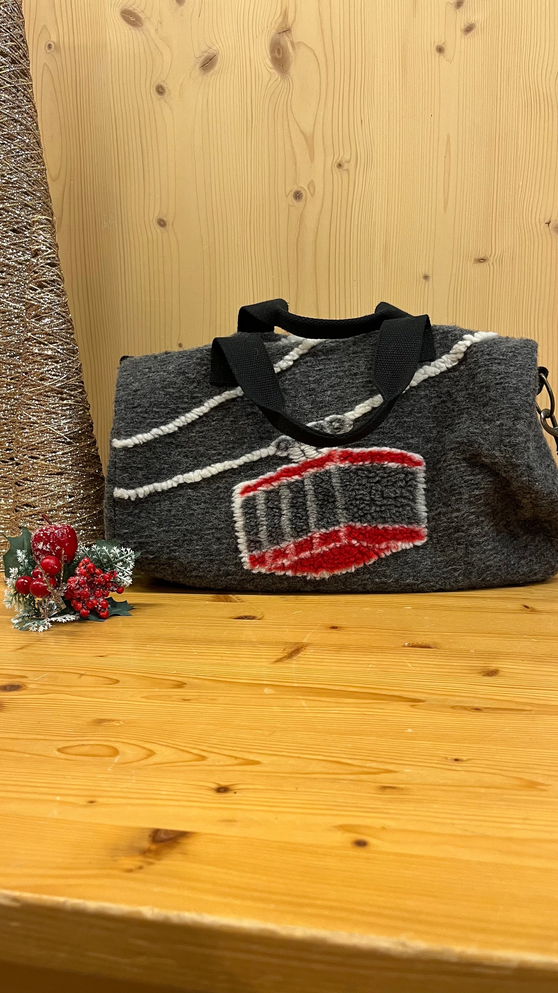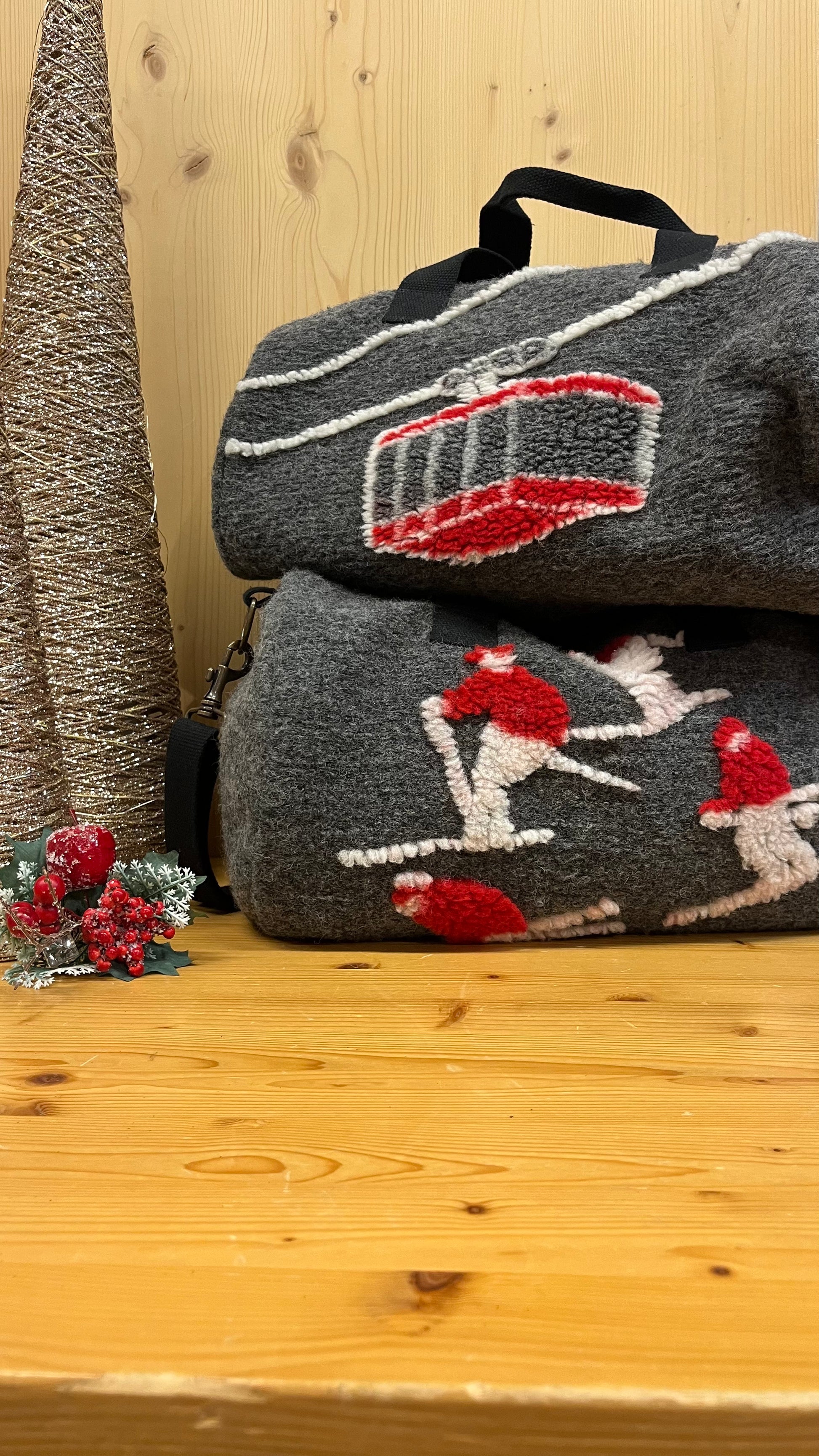 Borsone in lana cotta con chiusura a zip, ideale per sciatori, palestra o un weekend fuori porta. La fantasia con sciatori bianco/rosso su base grigia o cabinovia aggiunge stile e originalità al vostro outfit. Dimensioni 40x30 cm, perfetto anche come borsa per la carrozzina.