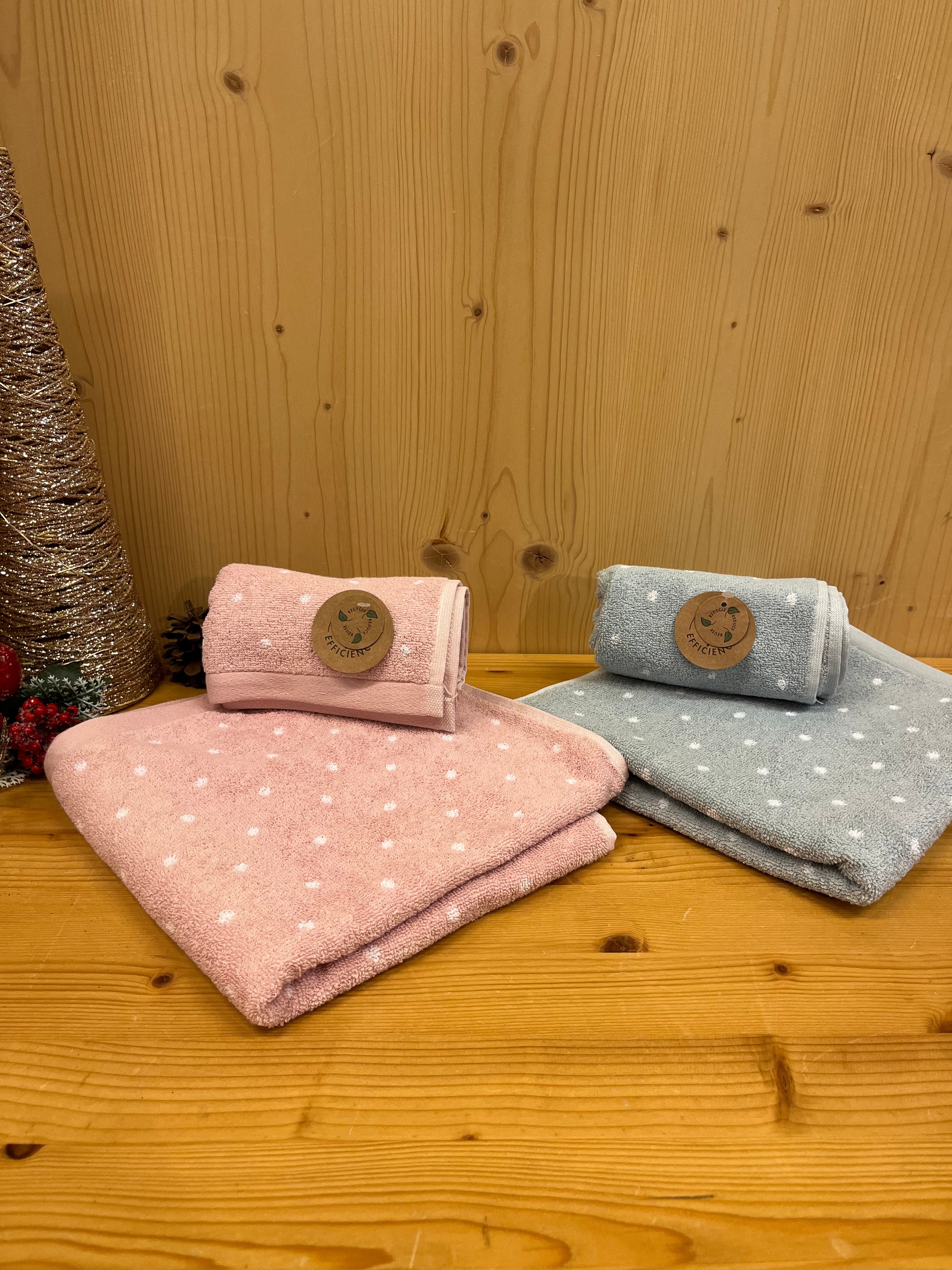 Set asciugamani 1+1 in morbida e assorbente spugna di cotone Efficience Dots. Un simpatico disegno a pois realizzato in bellissimi colori che andranno ad arredare il tuo bagno, anche coordinandoli tra loro.
