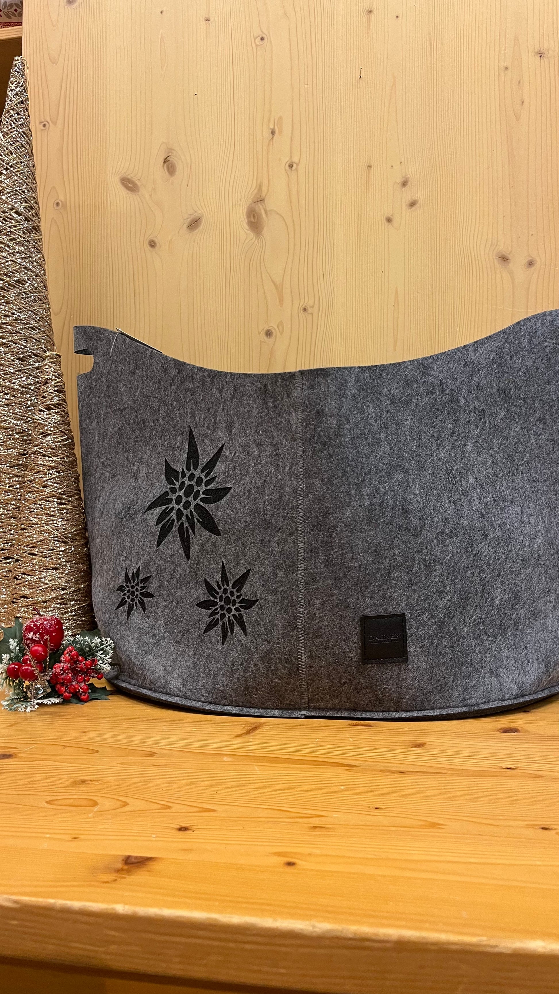 Cesta portariviste e porta legna Stella Alpina in stile tirolese, colore antracite. Perfetta per soggiorno, puoi usarla come porta legna, plaid, riviste o giochi. Dotata di decoro montano, manici per facile trasporto e struttura capiente. Idea regalo ideale. Marca Daunex.