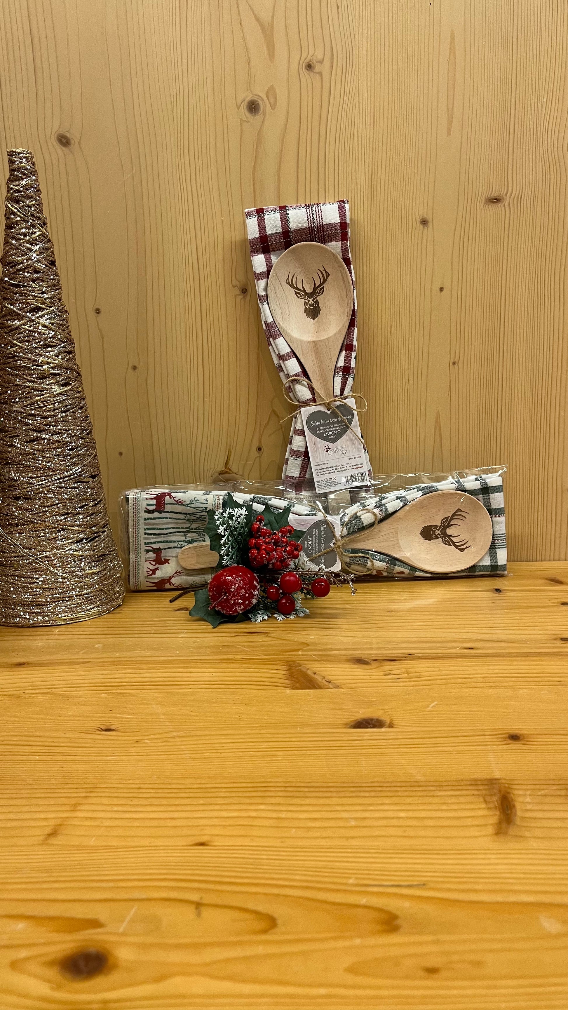 Set che include 2 pezzi: 1 strofinaccio verde livigno e 1 cucchiaio in legno con disegno del cervo del marchio Daunex.