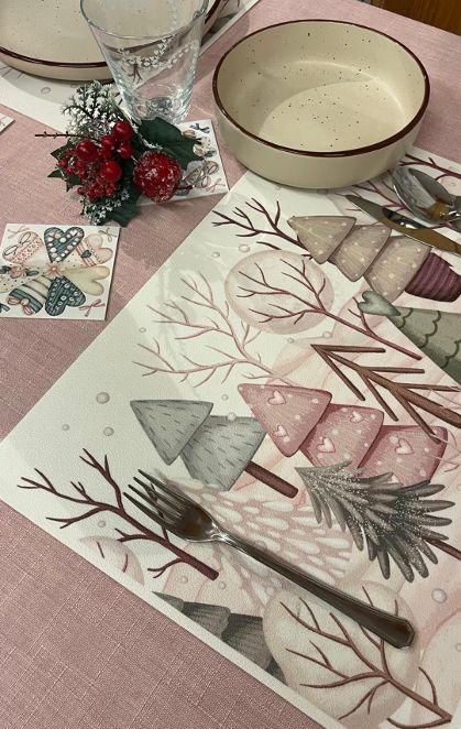 Elegante tovaglietta americana in vinile di Maison Sucrèe con incantevole fantasia di bosco innevato , sui toni del grigio, rosa e verde.